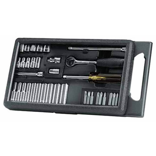 Комплектация Пластиковый планшет;. 10 торцевых головок с 6-гранным профилем 1/4″: 4,5,6,7,8,9,10,11,12 и 13мм;. 10 высоких торцевых головок с 6-гранным профилем 1/4″: 4,5,6,7,8,9,10,11,12, 13мм;. 1 рукоятка с храповым механизмом с быстрым отсоединением торцевой головки 1/4″ 150 мм;. 2 удлинителя: длиной 75 и 150мм;. 1 рукоятка 1/4″;. 1 карданный шарнир;. 1 адаптер для бит с шестигранным хвостовиком 1/4″;. Биты: -3х прямой шлиц: 4,5.5,6.5мм. -3х Phillips: 1,2,3. -3х Pozidriv: 1,2,3.