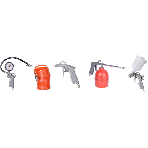 Комплектация Продувочный пистолет. Моющий пистолет с баком. Пульверизатор для покраски. Пистолет для подкачки колес. Нейлоновый спиральный шланг с коннектором